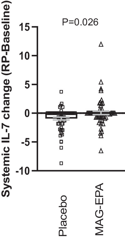 Results: Cancer proliferation index measured by Ki-67 expression was not statistically different between the intervention (3.10%) and placebo (2.85%) groups (p = 0.64). In the per protocol analyses, the adjusted estimated effect of MAG-EPA was greater but remained non-significant. Secondary outcome was the changes in plasma levels of 27 cytokines, of which only IL-7 was higher in MAG-EPA group compared to placebo (p = 0.026). Men randomized to MAG-EPA prior to surgery had four-fold higher EPA levels in prostate tissue compared to those on placebo.