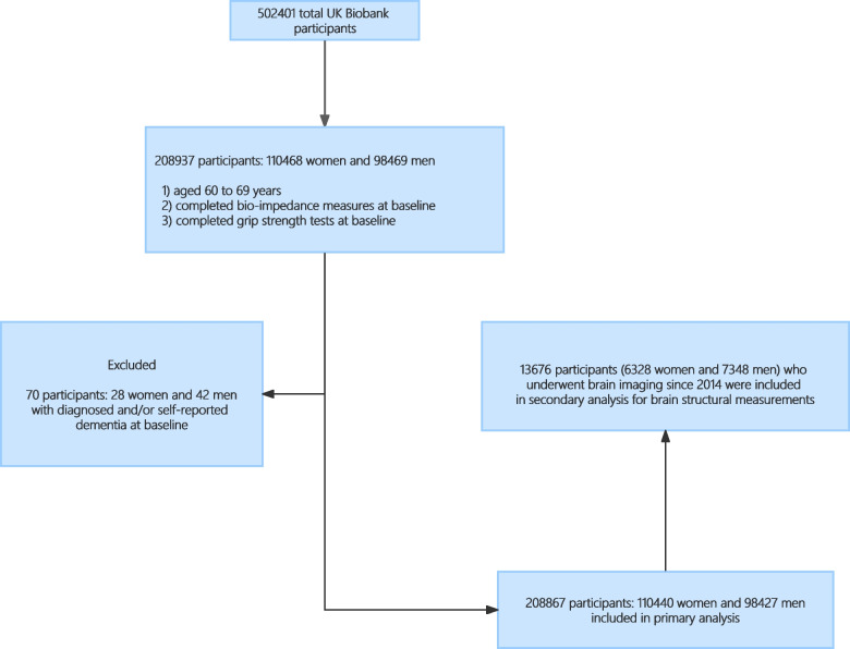 Methods: We included 208,867 participants from UK biobank, who aged 60 to 69 years at baseline. Dementia diagnoses were identified using hospital records and death register data. Hazard ratios (HRs) and 95% confidence intervals (CIs) were estimated using Cox proportional hazards models to evaluate the associations of obesity, sarcopenia, and sarcopenic obesity with dementia risk, stratified by sex. Stratified analyses were performed across dementia-related polygenic risk score (PRS). Restricted mean survival time models were established to estimate the difference and 95%CIs of dementia onset across different status. Additionally, linear regression models were employed to estimate associations of different status with brain imaging parameters. The mediation effects of chronic diseases were also examined.
