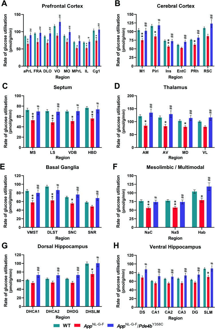 Meta-analysis of genome-wide association study data has implicated PDE4B in the pathogenesis of Alzheimer's disease (AD), the leading cause of senile dementia. PDE4B encodes one of four subtypes of cyclic adenosine monophosphate (cAMP)-specific phosphodiesterase-4 (PDE4A-D). To interrogate the involvement of PDE4B in the manifestation of AD-related phenotypes, the effects of a hypomorphic mutation (Pde4bY358C) that decreases PDE4B's cAMP hydrolytic activity were evaluated in the AppNL-G-F knock-in mouse model of AD using the Barnes maze test of spatial memory, 14C-2-deoxyglucose autoradiography, thioflavin-S staining of β-amyloid (Aβ) plaques, and inflammatory marker assay and transcriptomic analysis (RNA sequencing) of cerebral cortical tissue. At 12 months of age, AppNL-G-F mice exhibited spatial memory and brain metabolism deficits, which were prevented by the hypomorphic PDE4B in AppNL-G-F/Pde4bY358C mice, without a decrease in Aβ plaque burden. RNA sequencing revealed that, among the 531 transcripts differentially expressed in AppNL-G-F versus wild-type mice, only 13 transcripts from four genes - Ide, Btaf1, Padi2, and C1qb - were differentially expressed in AppNL-G-F/Pde4bY358C versus AppNL-G-F mice, identifying their potential involvement in the protective effect of hypomorphic PDE4B. Our data demonstrate that spatial memory and cerebral glucose metabolism deficits exhibited by 12-month-old AppNL-G-F mice are prevented by targeted inhibition of PDE4B. To our knowledge, this is the first demonstration of a protective effect of PDE4B subtype-specific inhibition in a preclinical model of AD. It thus identifies PDE4B as a key regulator of disease manifestation in the AppNL-G-F model and a promising therapeutic target for AD.