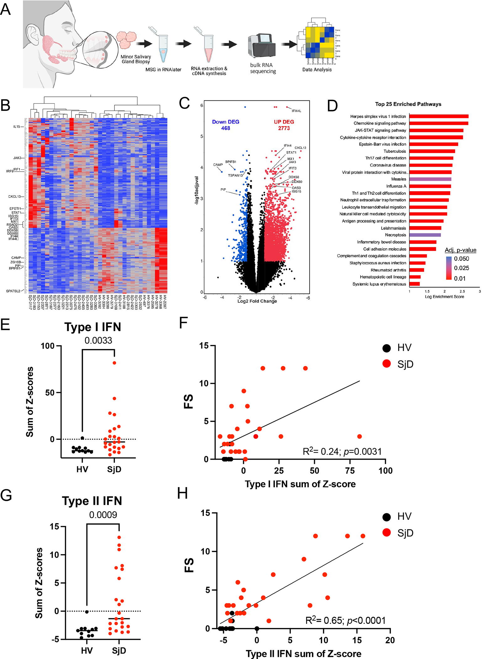 Results: RNAseq and IF showed activated JAK-STAT pathway in SjD MSGs. Elevated IFN-stimulated gene (ISGs) expression associated with clinical variables (eg, focus scores, anti-SSA positivity). scRNAseq of MSGs exhibited cell type-specific upregulation of JAK-STAT and ISGs; PBMCs showed similar trends, including markedly upregulated ISGs in monocytes. Ex vivo studies showed elevated basal pSTAT levels in SjD MSGs and PBMCs that were corrected with JAKi. SjD-derived pSGECs exhibited higher basal ISG expressions and exaggerated responses to IFN-β, which were normalised by JAKi without cytotoxicity.
