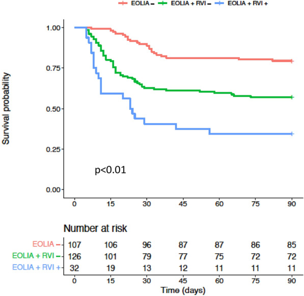 Results: 915 patients were hospitalized for COVID-19, 418 of them with ARDS. A total of 283 patients with available echocardiography were included. Eighteen (6.3%) patients received ECMO. After exclusion of these patients, 107 (40.5%) were classified as EOLIA -, 126 (47.5%) as EOLIA + RVI -, and 32 (12%) as EOLIA + RVI + . Ninety-day mortality was 21% in the EOLIA-group, 44% in the EOLIA + RVI-group, and 66% in the EOLIA + RVI + group (p < 0.001). After adjustment, RVI was statistically associated with 90-day mortality (HR = 1.92 [1.10-3.37]).