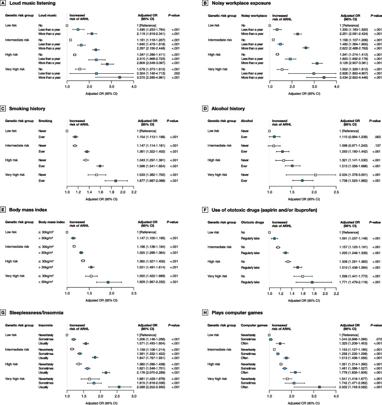 Results: Of the 376,464 participants, 87,066 (23.1%) cases belonged to the ARHL group, and 289,398 (76.9%) individuals comprised the control group in the UKBB. A very high PRS for ARHL had a 49% higher risk of ARHL than those with low PRS (adjusted OR, 1.49; 95% CI, 1.36-1.62; P < .001), which was replicated in the PMBB cohort. A very poor lifestyle was also associated with risk of ARHL (adjusted OR, 3.03; 95% CI, 2.75-3.35; P < .001). These risk factors showed joint effects with the risk of ARHL. Conversely, adherence to healthy lifestyle in relation to hearing mostly attenuated the risk of ARHL even in individuals with very high PRS (adjusted OR, 0.21; 95% CI, 0.09-0.52; P < .001).