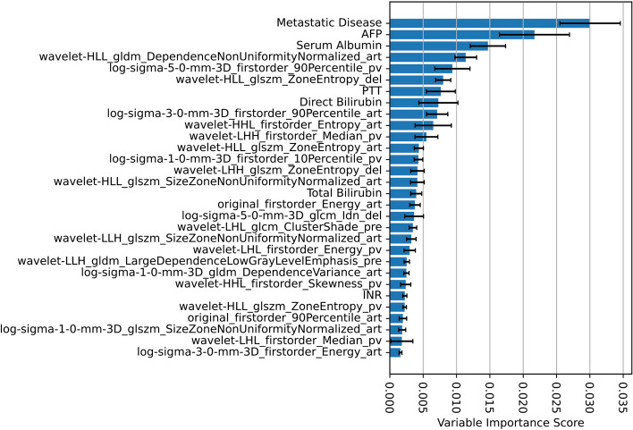 Methods: This retrospective study included all patients with multiphasic contrast-enhanced MRI at the time of diagnosis treated at our institution. Patients were censored at their last date of follow-up, end-of-observation, or liver transplantation date. The data were randomly sampled into independent cohorts, with 85% for development and 15% for independent validation. An automated liver segmentation framework was adopted for radiomic feature extraction. A random survival forest combined clinical and radiomic variables to predict overall survival (OS), and performance was evaluated using Harrell's C-index.