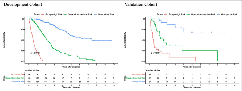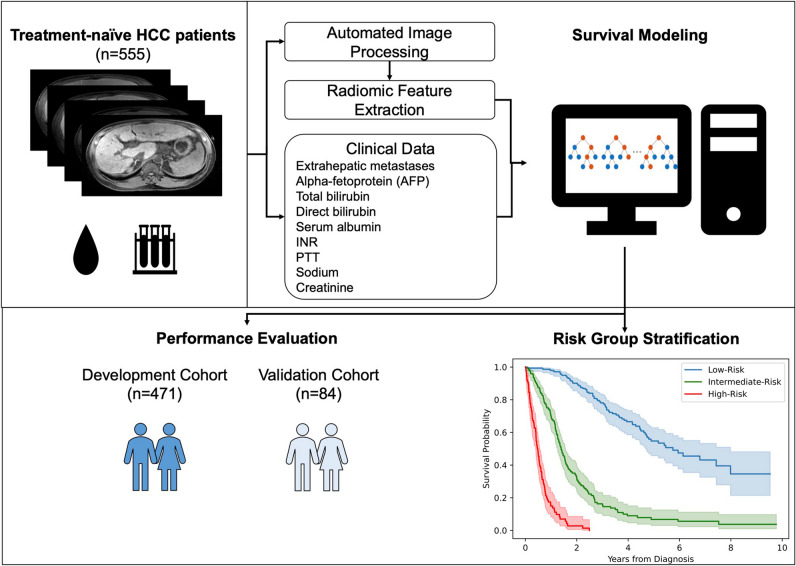 Results: A total of 555 treatment-naïve HCC patients (mean age, 63.8 years ± 8.9 [standard deviation]; 118 females) with MRI at the time of diagnosis were included, of which 287 (51.7%) died after a median time of 14.40 (interquartile range, 22.23) months, and had median followed up of 32.47 (interquartile range, 61.5) months. The developed risk prediction framework required 1.11 min on average and yielded C-indices of 0.8503 and 0.8234 in the development and independent validation cohorts, respectively, outperforming conventional clinical staging systems. Predicted risk scores were significantly associated with OS (p < .00001 in both cohorts).