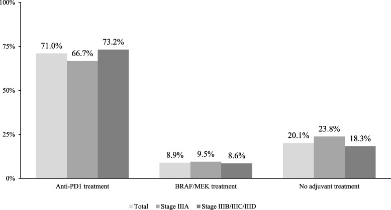 Methods: This non-interventional retrospective study included survey responses and data from patient records provided by US medical oncologists. Survey responses, patient demographic/clinical characteristics, treatment utilization, and reasons for treatment were reported descriptively. The association between patient and disease characteristics and AT selection was assessed using logistic and multinomial regression models, overall and stratified by AJCC8 substage (IIIA vs. IIIB/C/D) and type of AT received (anti-PD1 monotherapy, BRAF/MEK, no AT), respectively.