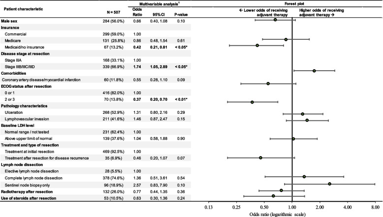 Results: In total 152 medical oncologists completed the survey and reviewed the charts of 507 patients (168 stage IIIA; 339 stages IIIB/IIIC/IIID); 405 (79.9%) patients received AT (360/405 (88.9%) received anti-PD1 therapy; 45/405 (11.1%) received BRAF/MEK therapy). Physicians reported clinical guidelines (61.2%), treatment efficacy (37.5%), and ECOG performance status (31.6%) as drivers of AT prescription. Patient-level data confirmed that improving patient outcomes (79%) was the main reason for anti-PD1 prescription; expected limited treatment benefit (37%), patient refusal (36%), and toxicity concerns (30%) were reasons for not prescribing AT. In multivariable analyses stage IIIB/IIIC/IIID disease significantly increased the probability of receiving AT (odds ratio [OR] 1.74) and anti-PD1 therapy (OR 1.82); ECOG 2/3 and Medicaid/no insurance decreased the probability of AT receipt (OR 0.37 and 0.42, respectively) and anti-PD1 therapy (OR 0.41 and 0.42, respectively) among all patients and patients with stage IIIA disease.