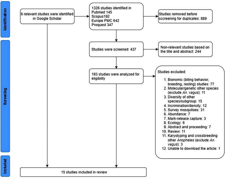 Results: Of the 1326 articles identified, 15 studies were considered for synthesis. The Anopheles spp. samples for this study came from Asia. Eleven studies used morphology to identify An. vagus, with singular studies using each of karyotype identification, chromosomal polytene identification, and cross-breeding experiments. Ten studies used molecular techniques to identify Anopheles spp., including An. vagus. Most studies discovered morphological variations of An. vagus either in the same or different areas and ecological settings. In this review, the members of An. vagus sensu lato grouped based on morphology (An. vagus, An. vagus vagus, An. vagus limosus, and An. limosus), karyotyping (form A and B), and molecular (An. vagus genotype A and B, An. vagus AN4 and AN5). Genetic analysis revealed a high conservation of the ITS2 fragment among members except for the An. vagus genotype B, which was, in fact, Anopheles sundaicus. This review also identified that An. vagus limosus and An. vagus vagus were nearly identical to the ITS2 sequence.