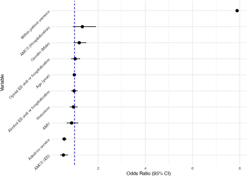 Results: A total of 5,367 patients with 10,871 ED index visits, and 2,127 revisits between 2018 and 2022 are included in the study. 45% (2,340/5,367) of patient were not admitted to hospital. 30-day revisits were less likely among the intervention group: Addiction Medicine Consult Services (AMCS) in the ED significantly reduced the odds of revisits (OR 0.53, 95% CI 0.39-0.71, p < 0.01) and first revisits (OR 0.42, 95% CI 0.33-0.53, p < 0.01). The AMU group was associated with lower revisits odds (OR 0.80, 95% CI 0.66-0.98, p = 0.03). For every additional year of age, the odds of revisits slightly decreased (OR 0.99, 95% CI 0.98-1.00, p = 0.01) and males were found to have an increased risk compared to females (OR 1.50, 95% CI 1.35-1.67, p < 0.01).