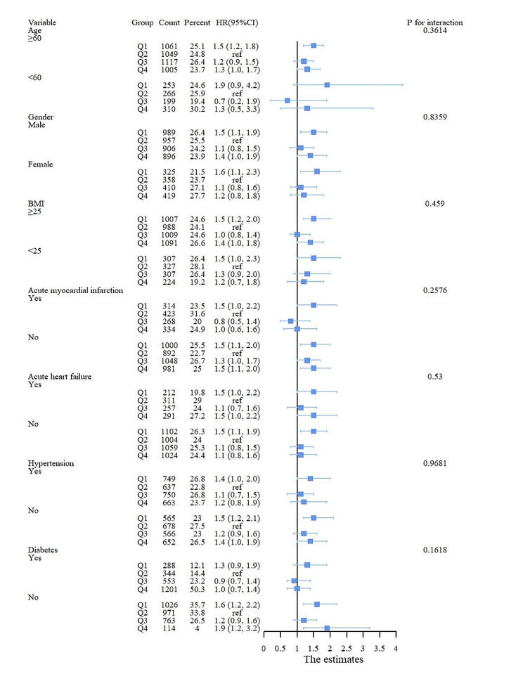 Methods: The HGI was calculated by constructing a linear regression equation between HbA1c and fasting plasma glucose (FPG). A Kaplan‒Meier survival analysis model was constructed based on the HGI quartiles to clarify the differences in all-cause mortality rates between groups, and the log-rank test was used to assess the differences between groups. The hazard ratio (HR) of HGI as a risk factor for outcome events was assessed using the Cox proportional risk model and restricted cubic spline (RCS), with the Q2 group serving as the reference group.