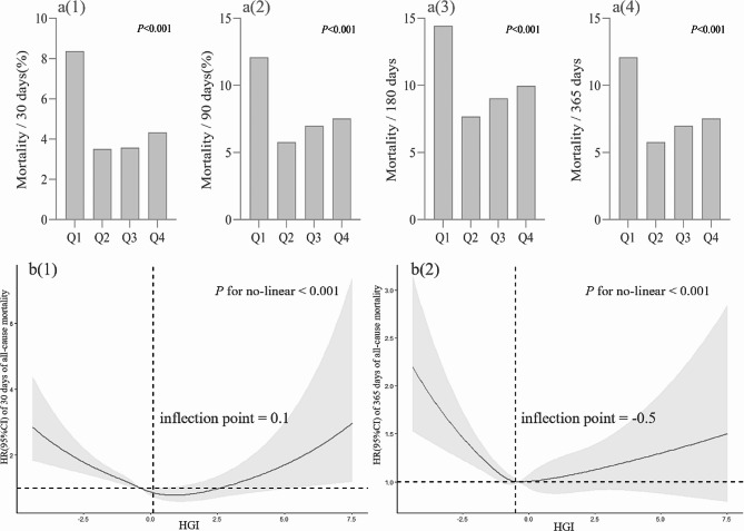 Conclusion: There was a significant correlation between HGI and all-cause mortality in patients with critical coronary artery disease, particularly in those with low HGI. HGI can be used as a potential indicator for assessing the short- and long-term risk of mortality in such patients.