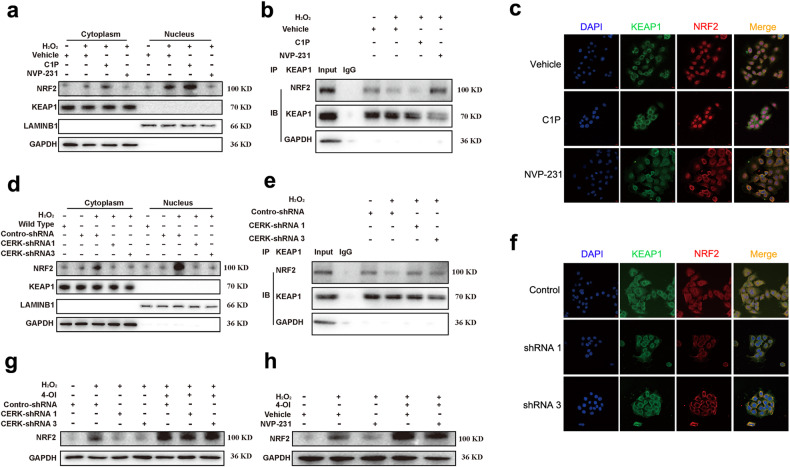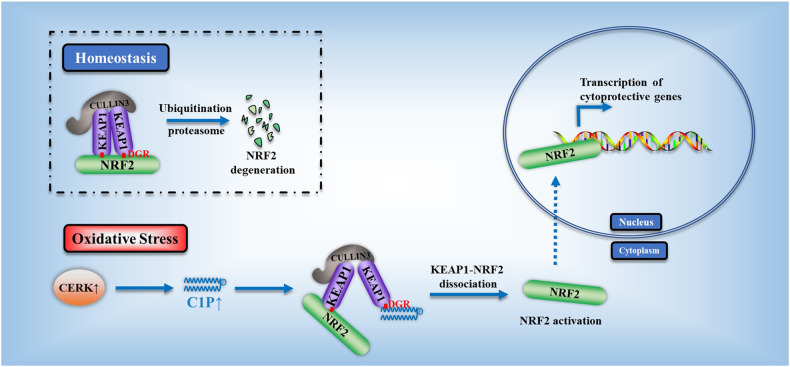 Acute liver injury is the basis of the pathogenesis of diverse liver diseases. However, the mechanism underlying liver injury is complex and not completely understood. In our study, we revealed that CERK, which phosphorylates ceramide to produce ceramide-1-phosphate (C1P), was the sphingolipid pathway-related protein that had the most significantly upregulated expression during acute liver injury. A functional study confirmed that CERK and C1P attenuate hepatic injury both in vitro and in vivo through antioxidant effects. Mechanistic studies have shown that CERK and C1P positively regulate the protein expression of NRF2, which is a crucial protein that helps maintain redox homeostasis. Furthermore, our results indicated that C1P disrupted the interaction between NRF2 and KEAP1 by competitively binding to KEAP1, which allowed for the nuclear translocation of NRF2. In addition, pull-down assays and molecular docking analyses revealed that C1P binds to the DGR domain of KEAP1, which allows it to maintain its interaction with NRF2. Importantly, these findings were verified in human primary hepatocytes and a mouse model of hepatic ischemia‒reperfusion injury. Taken together, our findings demonstrated that CERK-mediated C1P metabolism attenuates acute liver injury via the binding of C1P to the DGR domain of KEAP1 and subsequently the release and nuclear translocation of NRF2, which activates the transcription of cytoprotective and antioxidant genes. Our study suggested that the upregulation of CERK and C1P expression may serve as a potential antioxidant strategy to alleviate acute liver injury.