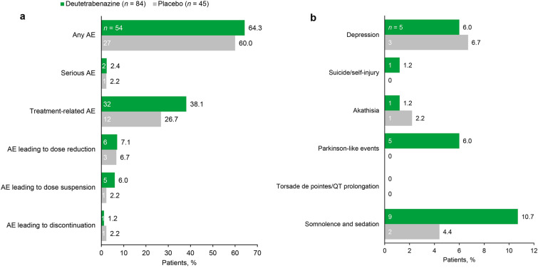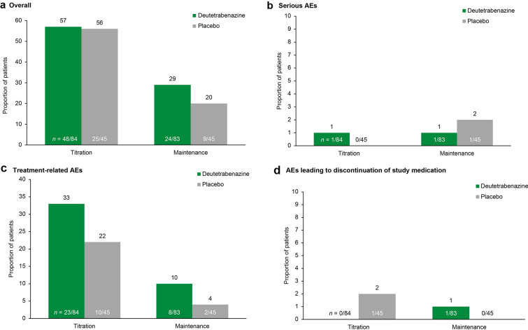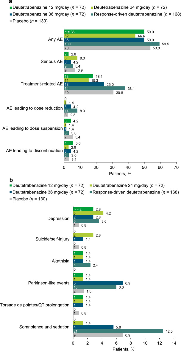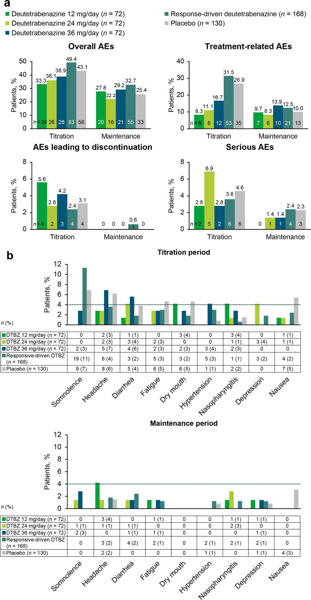Results: For TD, deutetrabenazine (n = 384) was generally well tolerated compared with placebo (n = 130). Adverse event (AE) incidence was numerically higher in the response-driven deutetrabenazine vs the fixed-dose deutetrabenazine and placebo groups, respectively (any AE, 59.5% vs 44.4-50.0% and 53.8%; treatment-related AE, 38.1% vs 18.1-25.0% and 30.8%). Serious AEs were reported for 2.8-8.3% of patients in the deutetrabenazine groups and 6.9% in the placebo group. Common AEs (≥ 4%) included headache, somnolence, nausea, anxiety, fatigue, dry mouth, and diarrhea. AE incidence was higher during the titration vs maintenance periods. For HD, AE incidence was numerically higher with deutetrabenazine (n = 84) vs placebo (n = 45; any AE, 64.3% vs 60.0%; treatment-related AE, 38.1% vs 26.7%); serious AEs were reported for similar proportions for the deutetrabenazine and placebo groups, 2.4% and 2.2%, respectively. Common AEs (≥ 4%) included irritability, fall, depression, dry mouth, and fatigue.