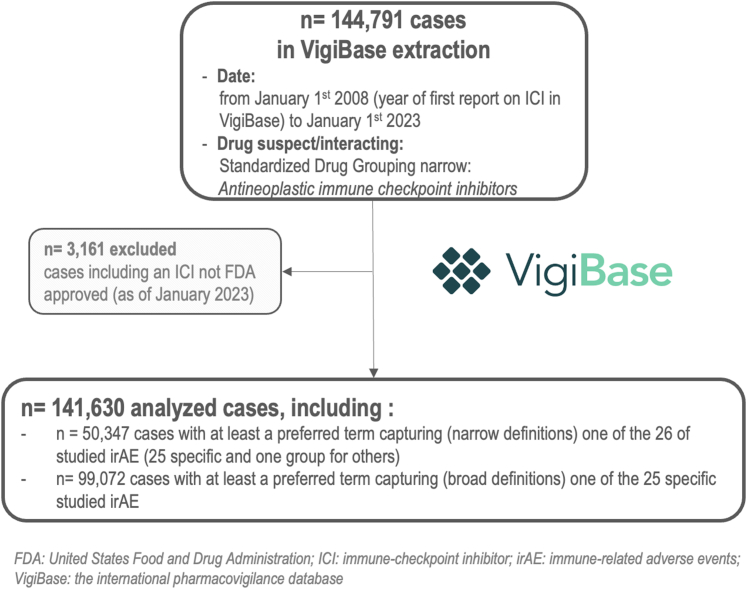 Findings: We distinguished 25 types of irAE (n = 50,347cases, single irAE/case in 84.9%). Cases mainly involved anti-PD1 (programmed-death-1) monotherapy (62.4%) in male (61.7%) aged 64.3 ± 12.6 years. After 2020 vs. prior to 2016, proportion of anti-CTLA4 (Cytotoxic-T-Lymphocyte-Antigen-4) monotherapy prescription almost vanished (1.6% vs. 47%, respectively) contrasting with increased use of anti-PDL1 (PD1-ligand) monotherapy (18% vs. 0.9%) and anti-CTLA4+anti-PD(L)1 combination (20% vs. 8.9%). Anti-LAG3 (Lymphocyte-Activation-Gene-3) prescription was limited (<1%) in the studied timeframe. After 2020, over 14 different cancer types were treated vs. almost exclusively melanoma and lung cancers before 2016. Overall, the most reported irAE were skin reactions (22.9%), pneumonitis (18.5%), enterocolitis (14.4%) and thyroiditis (12.1%). ICI-myotoxicities (6.6%) included myositis, myocarditis and myasthenia-gravis like syndrome and were the most overlapping irAE (up to 30% overlap, vs. <3% in general for other inter-irAE overlap). The top factors associated with specific irAE (odds-ratio>5) were presence of thymic cancer for ICI-myotoxicities or hepatitis; presence of melanoma for vitiligo, uveitis or sarcoidosis; specific types of ICI regimen (anti-LAG3 for meningitis, anti-CTLA4 for hypophysitis); and specific reporting regions (eastern Asia for cholangitis). Median time-to-onset ranged from 31 to 273 days, being shortest for myotoxicities and most delayed for skin-bullous auto-immune reactions. Overall fatality was highest for myocarditis = 27.6%, myasthenia = 23.1%, severe cutaneous adverse reactions (SCAR) = 22.1%, myositis = 21.9%, pneumonitis = 21%, and encephalomyelitis = 18%; generally decreasing after 2020, except for myasthenia and SCAR. When reported, irAE recurrence rate after rechallenge was 28.9% (n = 275/951).