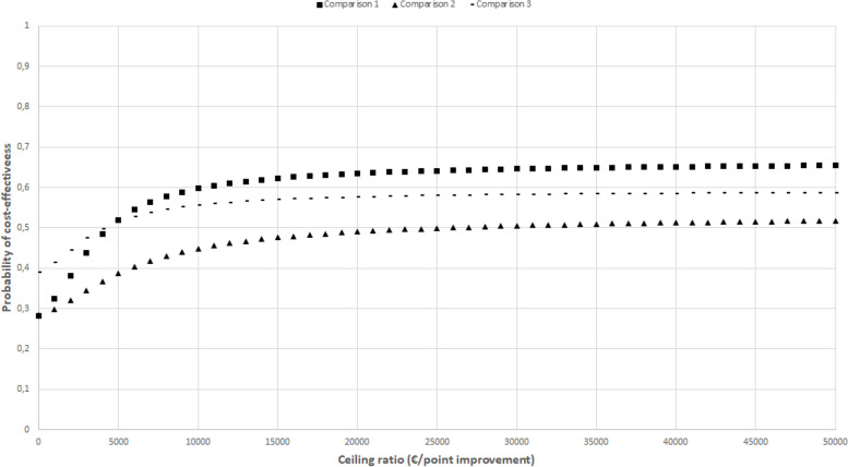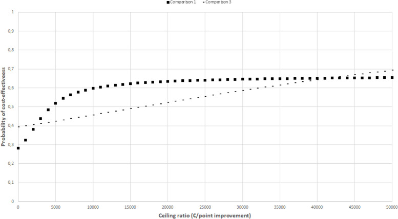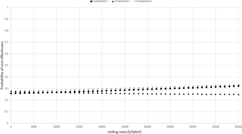 Results: None of the between-group differences in effects were statistically significant for any of the outcomes (QALY, back pain, leg pain, functioning, and global perceived effect) at the 26-weeks follow-up. The adjusted mean difference in total societal costs was €1718 (95% confidence interval [CI]: - 3020 to 6052) for comparison 1 (intervention group 1 versus usual care), €1640 (95%CI: - 3354 to 6106) for comparison 2 (intervention group 1 versus intervention group 2), and €770 (95%CI: - 3758 to 5702) for comparison 3 (intervention group 2 versus usual care). Except for the intervention costs, none of the aggregate and disaggregate cost differences were statistically significant. The maximum probability of all interventions being cost-effective compared to the control was low (< 0.7) for all effect measures.
