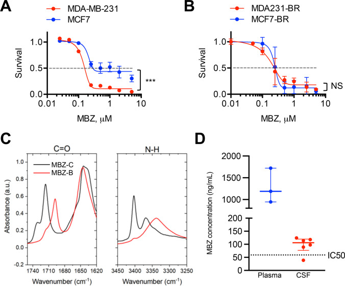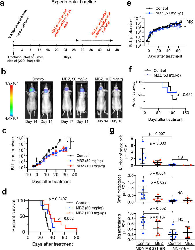Methods: A small-molecule screen involving TNBC cell lines identified benzimidazoles as potential therapeutic agents for further study. In vitro migration assays were used to evaluate cell migration capacity and the effect of MBZ. For in vivo testing, CNS metastasis was introduced into BALB/c athymic nude mice through internal carotid artery injections of brain-tropic MDA-MB-231-BR or MCF7-BR cells. Tumor growth and spread was monitored by bioluminescence imaging and immunohistochemistry. MBZ was given orally at 50 and 100 mg/kg doses. MBZ bioavailability was assayed by mass spectrometry.