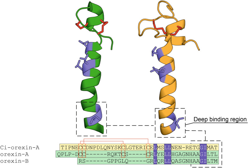 Tunicates are evolutionary model organisms bridging the gap between vertebrates and invertebrates. A genomic sequence in Ciona intestinalis (CiOX) shows high similarity to vertebrate orexin receptors and protostome allatotropin receptors (ATR). Here, molecular phylogeny suggested that CiOX is divergent from ATRs and human orexin receptors (hOX1/2). However, CiOX appears closer to hOX1/2 than to ATR both in terms of sequence percent identity and in its modelled binding cavity, as suggested by molecular modelling. CiOX was heterologously expressed in a recombinant HEK293 cell system. Human orexins weakly but concentration-dependently activated its Gq signalling (Ca2+ elevation), and the responses were inhibited by the non-selective orexin receptor antagonists TCS 1102 and almorexant, but only weakly by the OX1-selective antagonist SB-334867. Furthermore, the 5-/6-carboxytetramethylrhodamine (TAMRA)-labelled human orexin-A was able to bind to CiOX. Database mining was used to predict a potential endogenous C. intestinalis orexin peptide (Ci-orexin-A). Ci-orexin-A was able to displace TAMRA-orexin-A, but not to induce any calcium response at the CiOX. Consequently, we suggested that the orexin signalling system is conserved in Ciona intestinalis, although the relevant peptide-receptor interaction was not fully elucidated.