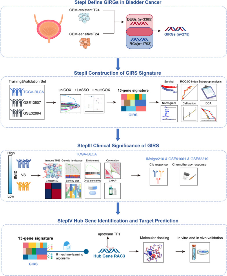 Conclusions: The GIRS signature offers a valuable complement to the conventional anatomic TNM staging system and molecular subtype stratification in bladder cancer. The hub gene, RAC3, plays a crucial role in BCa and is significantly associated with resistance to gemcitabine. The small molecular drug, PIK-75 having the potential as a therapeutic agent in the context of gemcitabine-resistant and immune-related pathways.