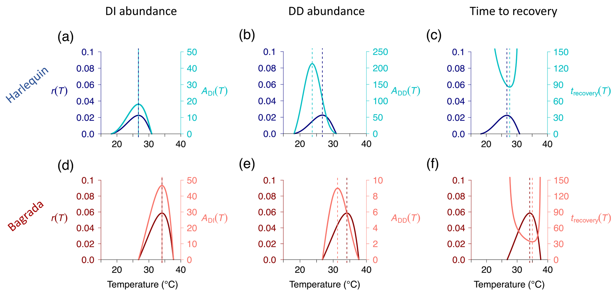 Keywords: climate envelope; conditions for population viability; delay differential equation population model; density‐independent abundance; temperature response of abundance; temperature response of life‐history traits.