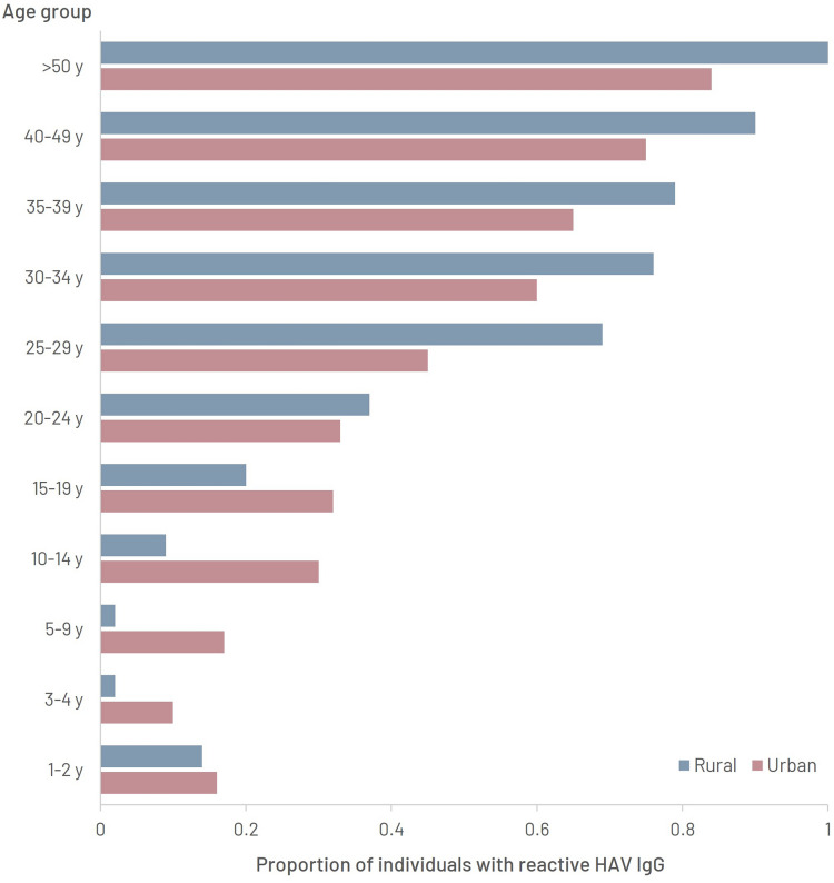 Methods: People from two geographic areas (urban and rural) were recruited/enrolled and stratified by age group. HAV-specific immunoglobulin G (IgG) antibodies were measured with a chemiluminescent microparticle immunoassay. Sociodemographic parameters, hepatitis medical history, disease knowledge, hygiene measures and sanitation were assessed via a purpose-made questionnaire. Age at midpoint of population immunity (AMPI) was estimated using Kaplan-Meier curves. Logistic regression analyses were carried out to determine factors that were statistically significantly associated (p < 0.05) with HAV seropositivity.