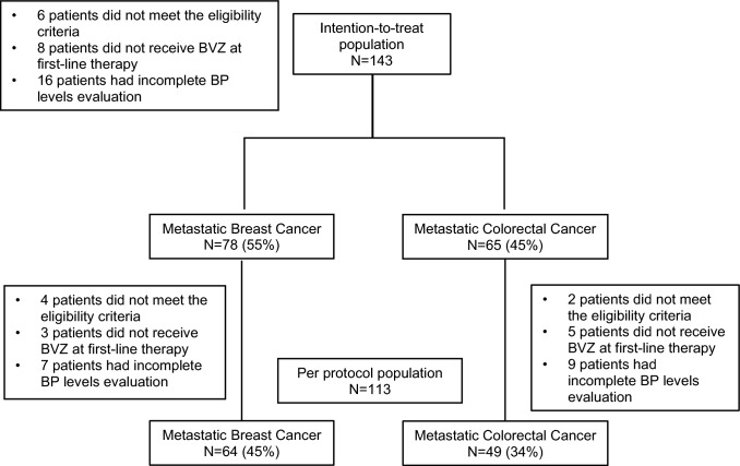 Keywords: Bevacizumab; Blood pressure; Metastatic breast cancer; Metastatic colorectal cancer.