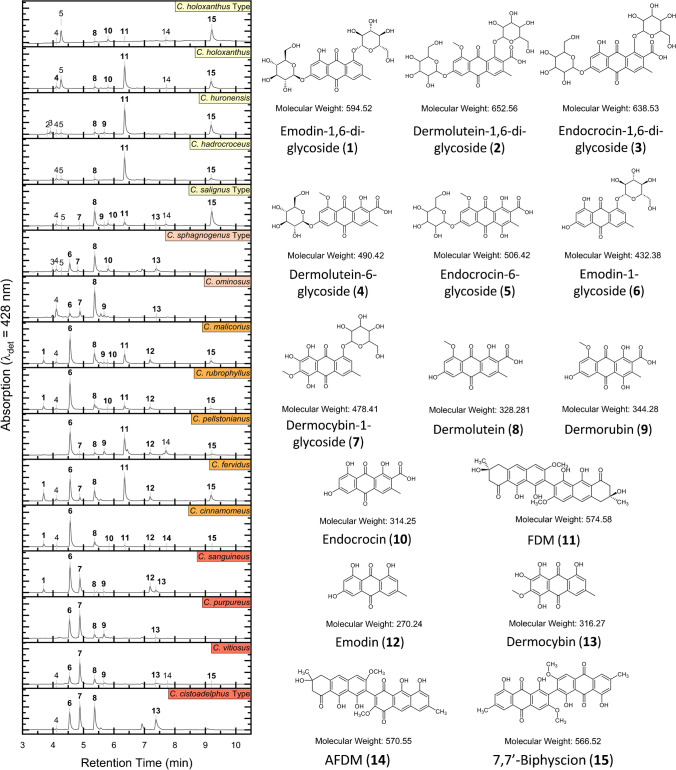 Cortinarius (Fr.) Fr. is one of the most species-rich genera in the Agaricales (Basidiomycota). Cortinarius subgen. Dermocybe (Fr.) Trog includes brightly coloured Cortinarii with anthraquinone pigments. The chemotaxonomic approach has always been as important as classical methods for species definition of Dermocybe and helped to improve overall species concepts. However, some species concepts within this group remain unclear. We therefore address this topic based on a combined phylogenetic, morphological, and pigment-chemical approach. For this, sequence data, HPLC-MS pigment profiles and spore sizes were included were included to obtain a better resolution of taxa. The study was based on 173 recent collections and 12 type specimens. A total of 117 rDNA ITS sequences were produced from the collections in this study, 102 sequences were retrieved from databases. We could detect and clearly delimit 19 Dermocybe species occurring in central European habitats, from which 16 are discussed in detail. Additionally, we grouped the detected anthraquinone pigments into four groups. This detailed analysis of dermocyboid Cortinarius species occurring in a restricted number of habitat types confirmed our hypothesis that species diversity is much higher than currently assumed. This high diversity is blurred by too wide and incorrect species concepts of several classical species like C. croceus and C. cinnamomeus. Molecular and chemotaxonomical studies carried out together with careful phenotypical analyses resulted in a good differentiation of species. A key is presented for these taxa to allow a better identification of Cortinarius subgenus Dermocybe spp. occurring in Central Europe mainly in the alpine range.