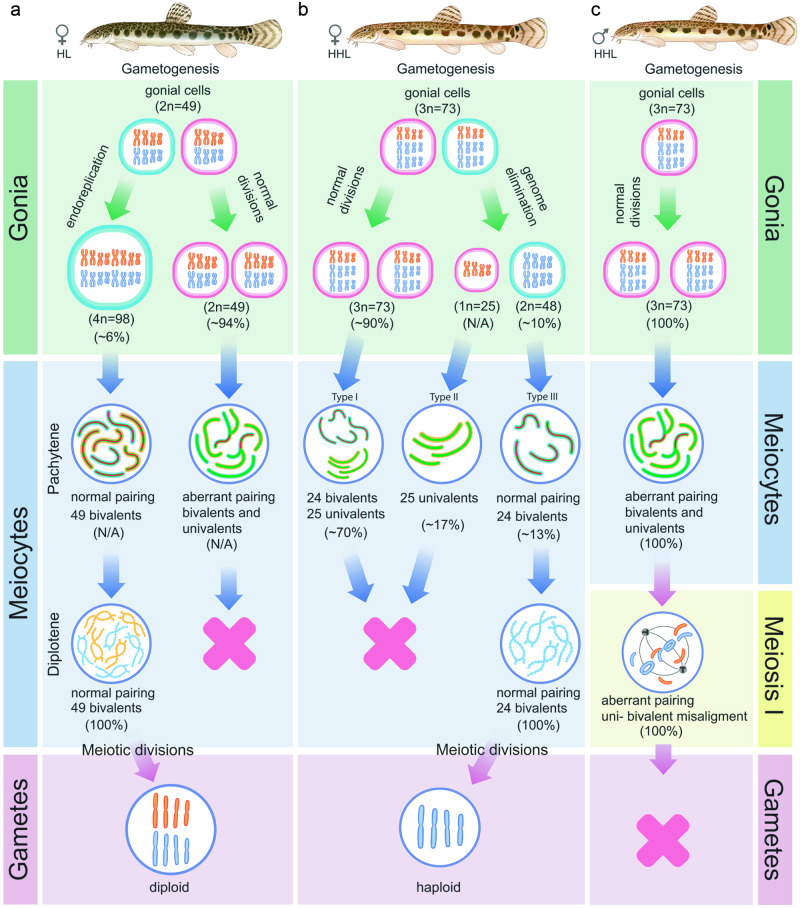 The cellular and molecular mechanisms governing sexual reproduction are conserved across eukaryotes. Nevertheless, hybridization can disrupt these mechanisms, leading to asexual reproduction, often accompanied by polyploidy. In this study, we investigate how ploidy level and ratio of parental genomes in hybrids affect their reproductive mode. We analyze the gametogenesis of sexual species and their diploid and triploid hybrids from the freshwater fish family Cobitidae, using newly developed cytogenetic markers. We find that diploid hybrid females possess oogonia and oocytes with original (diploid) and duplicated (tetraploid) ploidy. Diploid oocytes cannot progress beyond pachytene due to aberrant pairing. However, tetraploid oocytes, which emerge after premeiotic genome endoreplication, exhibit normal pairing and result in diploid gametes. Triploid hybrid females possess diploid, triploid, and haploid oogonia and oocytes. Triploid and haploid oocytes cannot progress beyond pachytene checkpoint due to aberrant chromosome pairing, while diploid oocytes have normal pairing in meiosis, resulting in haploid gametes. Diploid oocytes emerge after premeiotic elimination of a single-copied genome. Triploid hybrid males are sterile due to aberrant pairing and the failure of chromosomal segregation during meiotic divisions. Thus, changes in ploidy and genome dosage may lead to cyclical alteration of gametogenic pathways in hybrids.