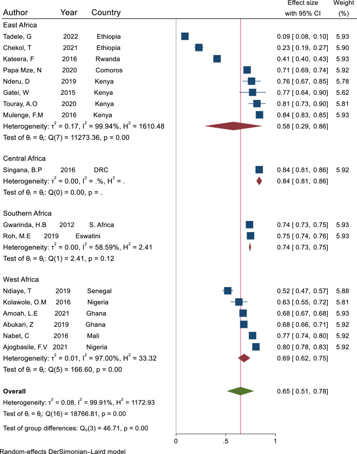Conclusion: The study shows substantial regional variation in Plasmodium falciparum parasite genetic diversity and MOI in SSA. These findings suggest a need for malaria control strategies and surveillance efforts considering regional-specific factors underlying Plasmodium falciparum infection.