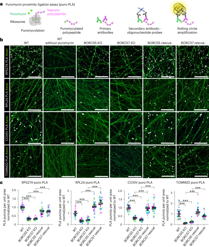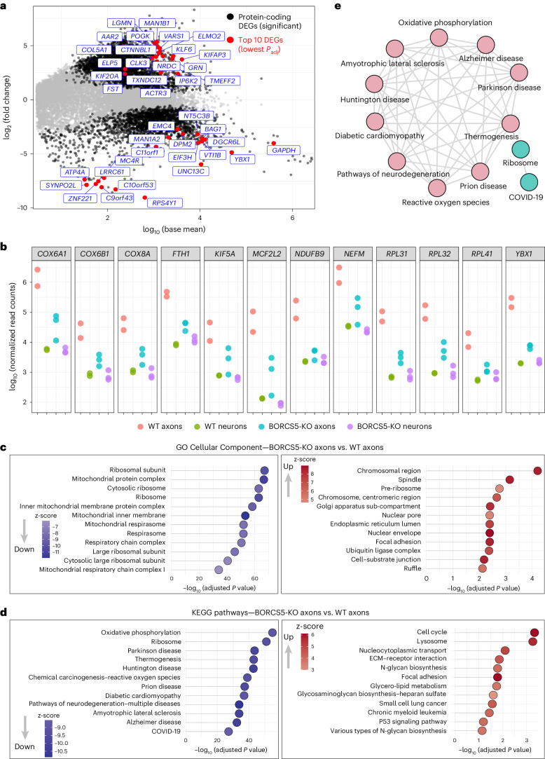 In neurons, RNA granules are transported along the axon for local translation away from the soma. Recent studies indicate that some of this transport involves hitchhiking of RNA granules on lysosome-related vesicles. In the present study, we leveraged the ability to prevent transport of these vesicles into the axon by knockout of the lysosome-kinesin adaptor BLOC-one-related complex (BORC) to identify a subset of axonal mRNAs that depend on lysosome-related vesicles for transport. We found that BORC knockout causes depletion of a large group of axonal mRNAs mainly encoding ribosomal and mitochondrial/oxidative phosphorylation proteins. This depletion results in mitochondrial defects and eventually leads to axonal degeneration in human induced pluripotent stem cell (iPSC)-derived and mouse neurons. Pathway analyses of the depleted mRNAs revealed a mechanistic connection of BORC deficiency with common neurodegenerative disorders. These results demonstrate that mRNA transport on lysosome-related vesicles is critical for the maintenance of axonal homeostasis and that its failure causes axonal degeneration.