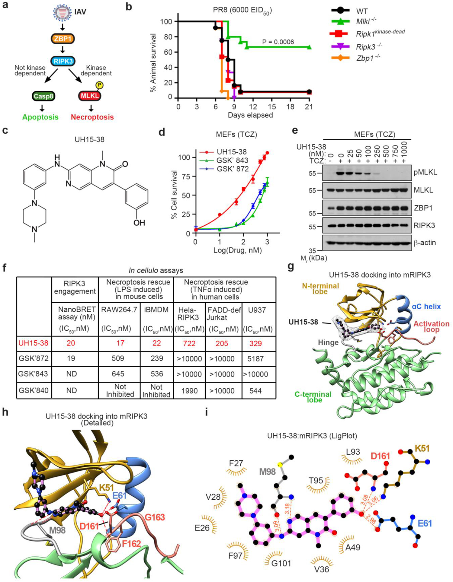 Severe influenza A virus (IAV) infections can result in hyper-inflammation, lung injury and acute respiratory distress syndrome1-5 (ARDS), for which there are no effective pharmacological therapies. Necroptosis is an attractive entry point for therapeutic intervention in ARDS and related inflammatory conditions because it drives pathogenic lung inflammation and lethality during severe IAV infection6-8 and can potentially be targeted by receptor interacting protein kinase 3 (RIPK3) inhibitors. Here we show that a newly developed RIPK3 inhibitor, UH15-38, potently and selectively blocked IAV-triggered necroptosis in alveolar epithelial cells in vivo. UH15-38 ameliorated lung inflammation and prevented mortality following infection with laboratory-adapted and pandemic strains of IAV, without compromising antiviral adaptive immune responses or impeding viral clearance. UH15-38 displayed robust therapeutic efficacy even when administered late in the course of infection, suggesting that RIPK3 blockade may provide clinical benefit in patients with IAV-driven ARDS and other hyper-inflammatory pathologies.