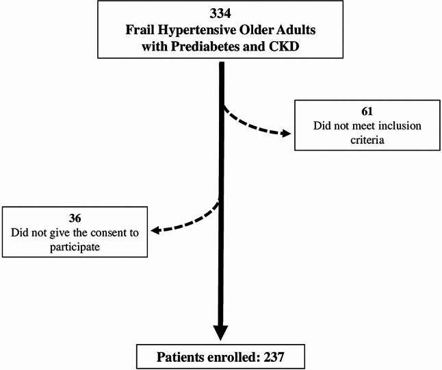 Methods: We conducted a study involving consecutive frail older patients with hypertension recruited from March 2021 to March 2023 at the ASL (local health unit of the Italian Ministry of Health) of Avellino, Italy, followed up after three months. Inclusion criteria comprised age over 65 years, prior diagnosis of hypertension without secondary causes, prediabetes, frailty status, Montreal Cognitive Assessment (MoCA) score < 26, and CKD with eGFR > 15 ml/min.