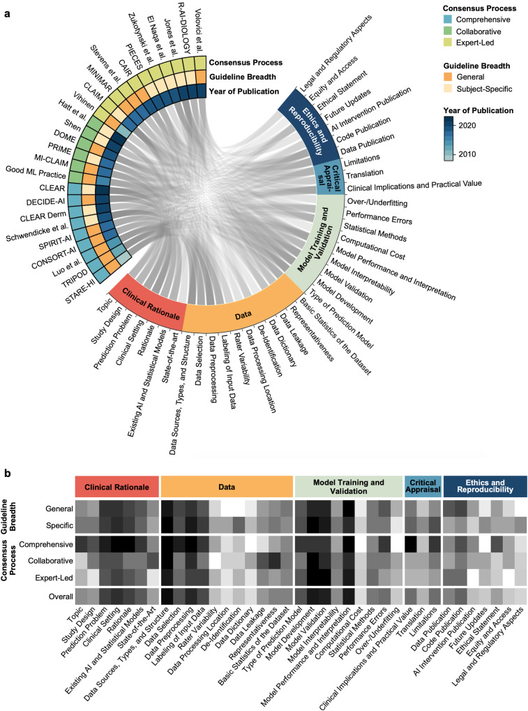 Methods: Based on a systematic review of academic publications and reporting standards demanded by both international consortia and regulatory stakeholders as well as leading journals in the fields of medicine and medical informatics, 26 reporting guidelines published between 2009 and 2023 were included in this analysis. Guidelines were stratified by breadth (general or specific to medical fields), underlying consensus quality, and target research phase (preclinical, translational, clinical) and subsequently analyzed regarding the overlap and variations in guideline items.