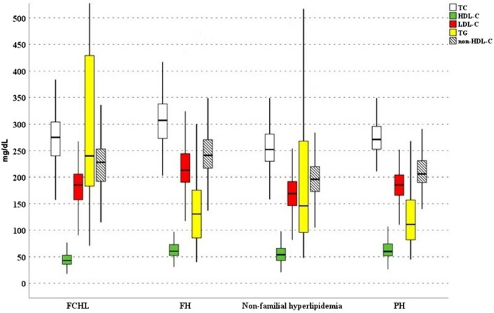 Results: Of the total of 798 patients, 361 were affected by non-familial hyperlipidemia (45.2%), while FCHL, FH and PH was described in 19.9%, 14.0% and 20.9% of patients, respectively. Overweight prevalence was higher in FCHL and non-familial hyperlipidemia patients than FH and PH patients. Subjects with overweight and obesity were independently associated with lower levels of high-density lipoprotein cholesterol (HDL-C) compared to patients with normal weight (52.4 and 46.0 vs 58.1, respectively; p < 0.0001); levels of triglycerides (TG) and non-HDL-C were higher in patients with overweight and obesity than patients with normal weight (257.3 and 290.9 vs 194.8, and 221.5 and 219.6 vs 210.1, p < 0.0001 and p = 0.01, respectively), while no differences were observed between patients with overweight and obesity.