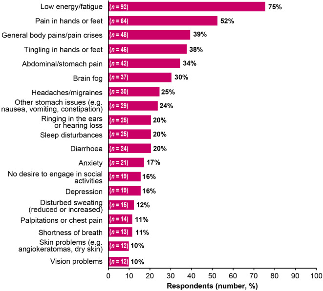 Results: A total of 280 respondents with FD completed the survey; they had a mean age of 47 years, and 68% (191/280) were women. Most were currently receiving FD treatment (84%, 234/280) with enzyme replacement therapy (ERT) (89%, 208/234) or chaperone therapy (11%, 26/234). Common symptoms included low energy/fatigue (72%, 201/280), tingling (62%, 174/280) or pain in the hands/feet (60%, 168/280), ringing in ears/hearing loss (54%, 151/280), general body pains/pain crises (51%, 143/280), and abdominal/stomach pain (50%, 140/280). More than half (51%, 144/280) of respondents reported their symptoms as bothersome (38%, 106/280) or difficult to control (14%, 38/280). Temporary symptom worsening between infusions was reported by about half of respondents: 51% (108/211) currently receiving ERT and 48% (14/29) previously receiving ERT. Only 48% (59/122) of respondents reported their symptom worsening to their physician. Of those who reported it, 41% (24/59) said that their physician prescribed medication to manage their symptoms or changed their treatment regimen.
