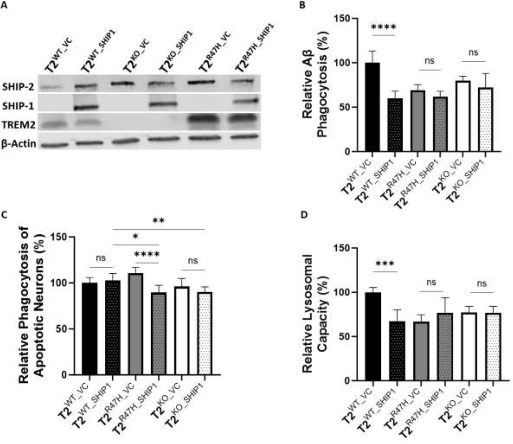 Microglia play a pivotal role in the pathology of Alzheimer's Disease (AD), with the Triggering Receptor Expressed on Myeloid cells 2 (TREM2) central to their neuroprotective functions. The R47H variant of TREM2 has emerged as a significant genetic risk factor for AD, leading to a loss-of-function phenotype in mouse AD models. This study elucidates the roles of TREM2 in human microglia-like HMC3 cells and the regulation of these functions by SH2-containing inositol-5'-phosphatase 1 (SHIP1). Using stable cell lines expressing wild-type TREM2, the R47H variant, and TREM2-deficient lines, we found that functional TREM2 is essential for the phagocytosis of Aβ, lysosomal capacity, and mitochondrial activity. Notably, the R47H variant displayed increased phagocytic activity towards apoptotic neurons. Introducing SHIP1, known to modulate TREM2 signaling in other cells, revealed its role as a negative regulator of these TREM2-mediated functions. Moreover, pharmacological inhibition of both SHIP1 and its isoform SHIP2 amplified Aβ phagocytosis and lysosomal capacity, independently of TREM2 or SHIP1 expression, suggesting a potential regulatory role for SHIP2 in these functions. The absence of TREM2, combined with the presence of both SHIP isoforms, suppressed mitochondrial activity. However, pan-SHIP1/2 inhibition enhanced mitochondrial function in these cells. In summary, our findings offer a deeper understanding of the relationship between TREM2 variants and SHIP1 in microglial functions, and emphasize the therapeutic potential of targeting the TREM2 and SHIP1 pathways in microglia for neurodegenerative diseases.