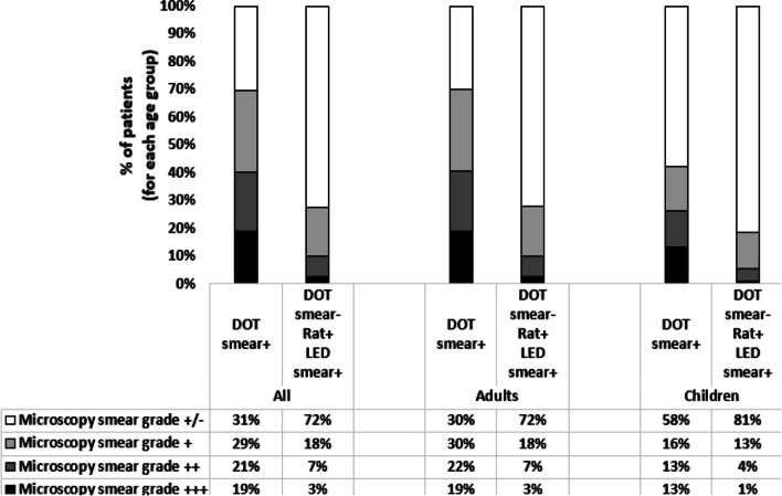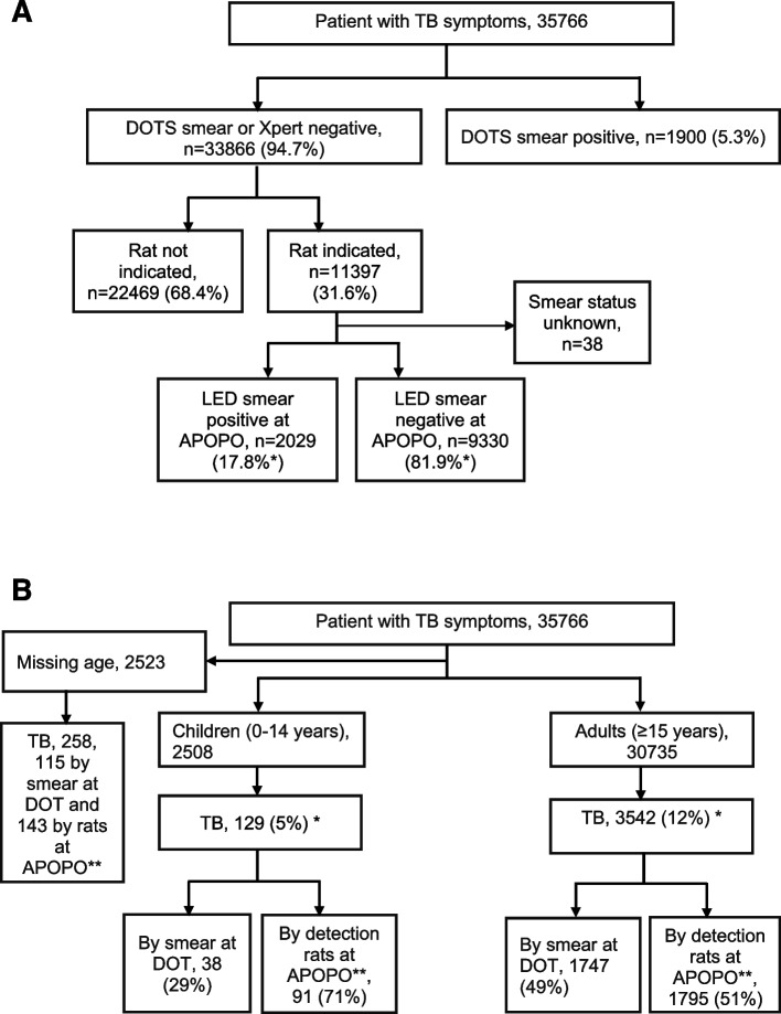 Results: From 35,766 patients, 5.3% (1900/35,766) were smear-positive and 94.7% (33,866/35,766) were smear or Xpert-negatives at DOTS facility. Of those with negative results, 2029 TB cases were detected using rats, contributing to 52% (2029/3929 of total TB identified), which otherwise would have been missed. Compared to DOT facilities, rats were six-fold more likely to detect TB among Acid Fast Bacilli (AFB) 1+/scanty [90% (1829/2029) versus 60% (1139/1900), odds ratio, OR = 6.11, 95% confidence interval, CI: 5.14-7.26]; twice more likely to identify TB cases among children [71% (91/129) versus 51% (1795/3542), OR = 2.3, 95% CI: 1.59-3.42]; and twice more likely to identify TB cases among children with AFB 1+/scanty than adults with the same MTB-load [5% (86/1703) versus 3% (28/1067), OR = 2.0, 95% CI: 1.28-3.03].