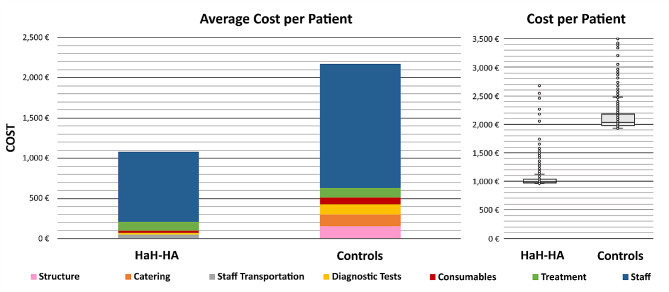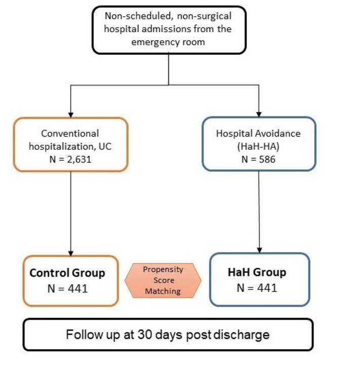 Methods: A retrospective cost-consequence analysis of all first episodes of HaH-HA, directly admitted from the emergency room (ER) in 2017-2018, was carried out with a health system perspective. HaH-HA was compared with a propensity-score-matched group of contemporary patients admitted to conventional hospitalization (Controls). Mortality, re-admissions, ER visits, and direct healthcare costs were evaluated.