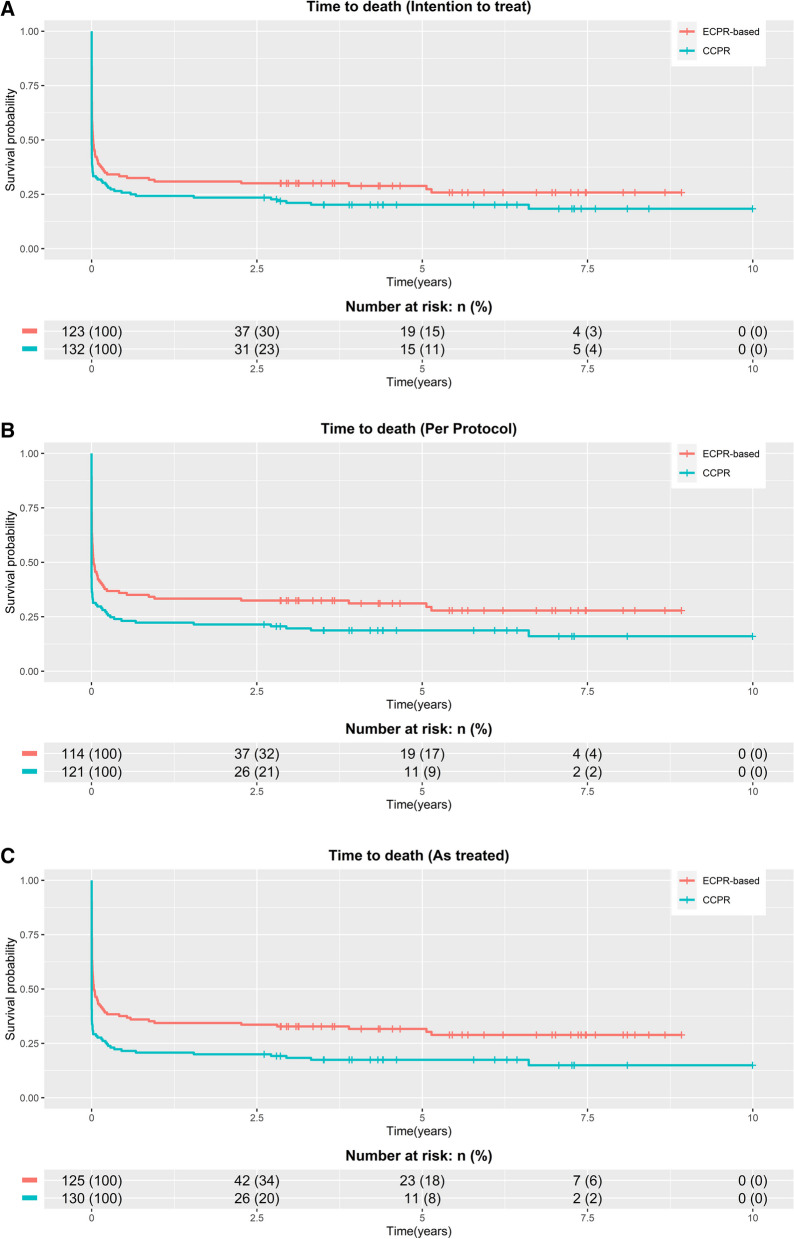 Results: From March 2013 to October 2020, 264 patients were randomized during ongoing resuscitation on scene, and 256 patients were enrolled. Long-term follow-up was performed 5.3 (interquartile range 3.8-7.2) years after initial randomization and was completed in 255 of 256 patients (99.6%). In total, 34/123 (27.6%) patients in the ECPR-based group and 26/132 (19.7%) in the CCPR group were alive (log-rank P = 0.01). There were no significant differences between the treatment groups in the neurological outcome, survival after hospital discharge, risk of hospitalization, major cardiovascular events and quality of life. Of long-term survivors, 1/34 (2.9%) in the ECPR-based arm and 1/26 (3.8%) in the CCPR arm had poor neurological outcome (both patients had a cerebral performance category score of 3).