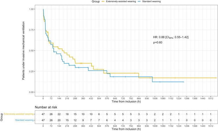 Results: From May 2019 to March 2023, 98 patients were included and randomized in the study (49 in each group). Four patients were excluded from the intention-to-treat population (2 in both groups); therefore, 47 patients were analyzed in each group. The extensively-assisted weaning group had a higher median age (68 [58-73] vs. 62 [55-71] yrs.) and similar sex ratio (62% male vs. 57%). Time until successful extubation was not significantly different between extensively-assisted and standard weaning groups (median, 172 [50-436] vs. 95 [47-232] hours, Cox hazard ratio for successful extubation, 0.88 [95% confidence interval: 0.55-1.42] using the standard weaning group as a reference; p = 0.60). All secondary outcomes were not significantly different between groups.