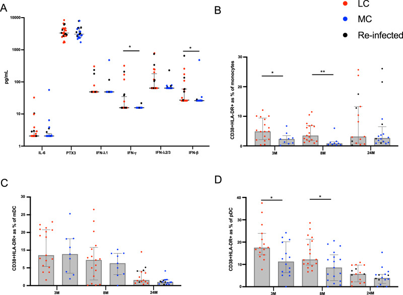 A Significantly elevated IFN-γ and IFN-β in LC at 24-months. B Higher frequencies of activated monocytes at 3- and 8-month, but not 24-months. C Lower percentages of activated myeloid dendritic cells (mDC) at 24-months. D Higher percentages of activated plasmacytoid dendritic cells (pDC) at 3- and 8-month that decreased 24-months. Data shown as medians with interquartile ranges. LC Long COVID, MC matched controls. Mann–Whitney U test (two-sided) was used for un-paired analysis, p < 0.05 (*), < 0.01 (**) were considered significant. Data points represent n = 31 biologically independent samples per group. Source data are provided as a Source Data file.