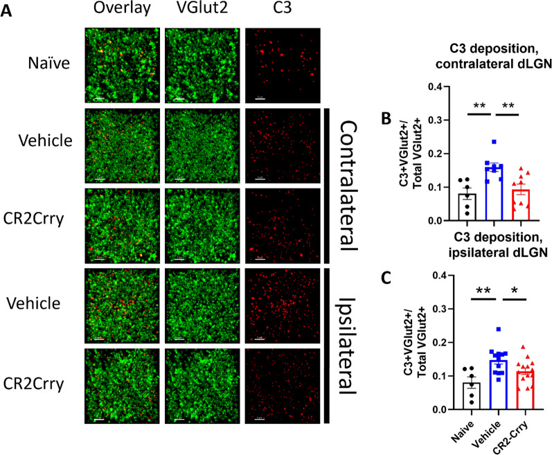 Results: At 3 days after TBI, complement component C3 was deposited on retinogeniculate synapses in the dLGN both ipsilateral and contralateral to the lesion, which was reduced in CR2-Crry treated animals. This was associated with microglia morphological changes in both the ipsilateral and contralateral dLGN, with a less ramified phenotype in vehicle compared to CR2-Crry treated animals. Microglia in vehicle treated animals also had a greater internalized VGlut2 + synaptic volume after TBI compared to CR2-Crry treated animals. Microglia morphological changes seen acutely persisted for at least 49 days after injury. Complement inhibition also reduced microglial synaptic internalization in the contralateral dLGN and increased the association between VGLUT2 and PSD95 puncta, indicating preservation of intact synapses. Unexpectedly, there were no changes in the thickness of the inner retina, retinal nerve fiber layer or retinal ganglion layer. Neuropathological changes in the dLGN were accompanied by reduced visual acuity at subacute and chronic time points after TBI, with improvement seen in CR2-Crry treated animals.