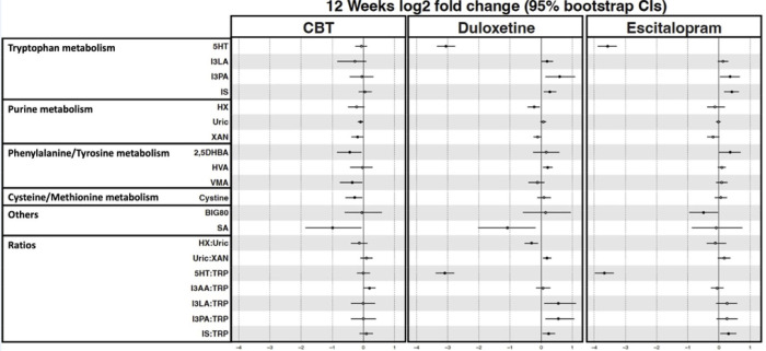 Metabolomics signatures of serotonin reuptake inhibitor (escitalopram), serotonin norepinephrine reuptake inhibitor (duloxetine) and cognitive-behavioral therapy on key neurotransmitter pathways in major depressive disorder.J Affect Disord. 2025 Apr 15;375:397-405. doi: 10.1016/j.jad.2025.01.064. Epub 2025 Jan 14. J Affect Disord. 2025. PMID: 39818336 Clinical Trial.