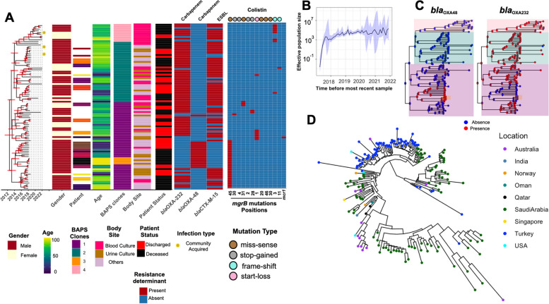 Methods: In this study, we conducted an in-depth genomic analysis on a large-scale collection of 328 multidrug-resistant (MDR) K. pneumoniae strains recovered from 239 patients from a single major hospital in the western coastal city of Jeddah in Saudi Arabia from 2014 through 2022. We employed a broad range of phylogenetic and phylodynamic methods to understand the evolution of the predominant clones on epidemiological time scales, virulence and resistance determinants, and their dynamics. We also integrated the genomic data with detailed electronic health record (EHR) data for the patients to understand the clinical implications of the resistance and virulence of different strains.