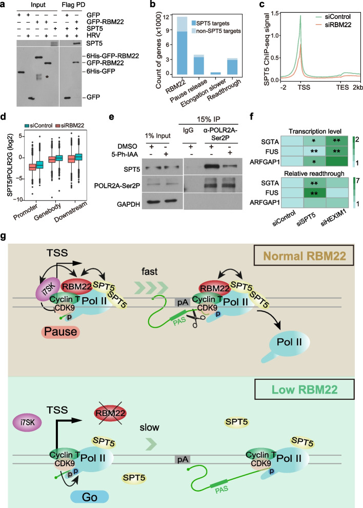 Results: Here, we describe a direct role of splicing factor RBM22 in coordinating multiple steps of RNA Polymerase II (RNAPII) transcription in human cells. The RBM22 protein widely occupies the RNAPII-transcribed gene locus in the nucleus. Loss of RBM22 promotes RNAPII pause release, reduces elongation velocity, and provokes transcriptional readthrough genome-wide, coupled with production of transcripts containing sequences from downstream of the gene. RBM22 preferentially binds to the hyperphosphorylated, transcriptionally engaged RNAPII and coordinates its dynamics by regulating the homeostasis of the 7SK-P-TEFb complex and the association between RNAPII and SPT5 at the chromatin level.