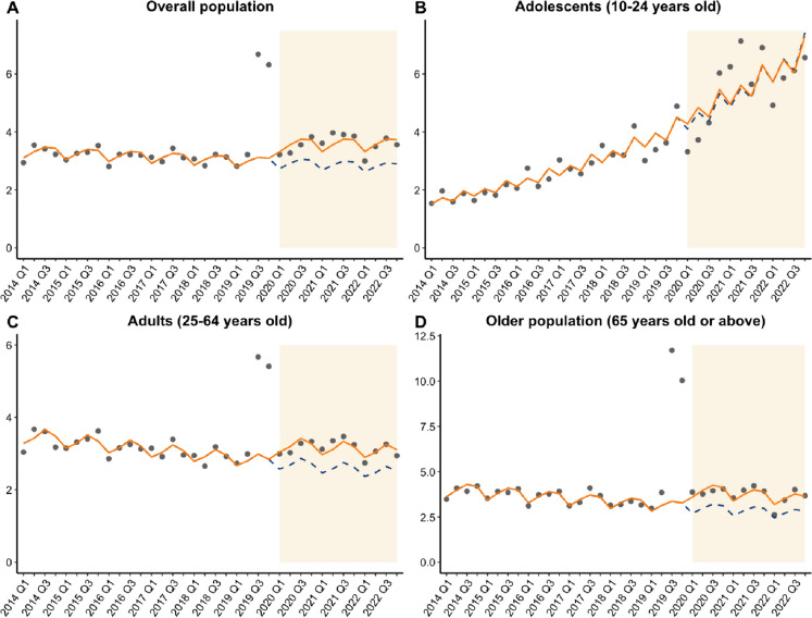 Results: We found an immediate increase in depression incidence (RR = 1.21, 95% CI: 1.10-1.33, p < 0.001) in the population after the pandemic began with non-significant slope change, suggesting a sustained effect until the end of 2022. Subgroup analysis showed that the increases in incidence were significant among adults and the older population, but not adolescents. Depression patients newly diagnosed during the pandemic used 11% fewer resources than the pre-pandemic patients in the first diagnosis year. Pre-existing depression patients also had an immediate decrease of 16% in overall all-cause service use since the pandemic, with a positive slope change indicating a gradual rebound over a 3-year period.