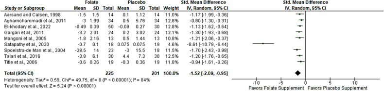 Results: Data from 9 trials with 426 patients living with T2DM were analyzed. Folic acid supplementation significantly revealed a large effect size on homocysteine levels compared to placebo, SMD = -1.53, 95%CI (-2.14,-0.93), p < 0.05. Additionally, we observed a medium marginal effect size on C-reactive protein (SMD = -0.68, 95%CI (-1.34, -0.01), p = 0.05). However, no significant effect on tumor necrosis factor-α (SMD = -0.86, 95%CI (-2.65, 0.93), p = 0.34), and interleukin-6 (SMD = -0.04, 95%CI (-1.08, 1.01), p = 0.95) was observed.