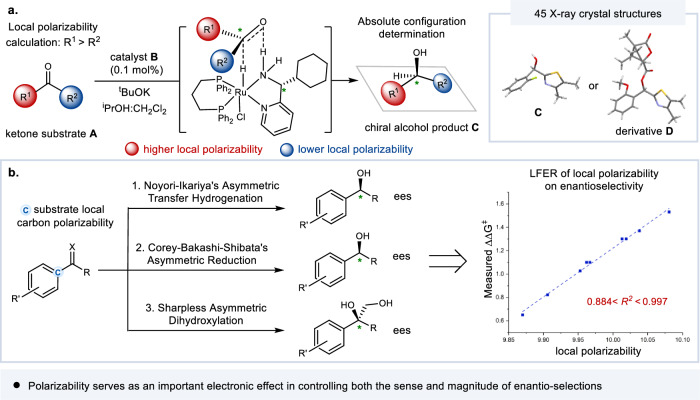 The prevalence of chirality, or, handedness in biological world is a fundamental phenomenon and a characteristic hallmark of life. Thus, understanding the origin of enantio-selection, i.e., the sense and magnitude of asymmetric induction, has been a long-pursued goal in asymmetric catalysis. Herein, we demonstrated a polarizability-derived electronic effect that was shown to be capable of rationalizing a broad range of stereochemical observations made in the field of asymmetric catalysis. This effect provided a consistent enantio-control model for the prediction of major enantiomers formed in a ruthenium-catalyzed asymmetric transfer hydrogenations of ketones. Direct and quantitative linear free energy relationships between substrates' local polarizabilities and observed enantio-selectivity were also revealed in three widely known asymmetric catalytic systems covering both reductions and oxidations. This broadly applicable polarizability-based electronic effect, in conjunction with conventional wisdom mainly leveraging on steric effect considerations, should aid rational design of enantio-selective processes for better production of chiral substances.