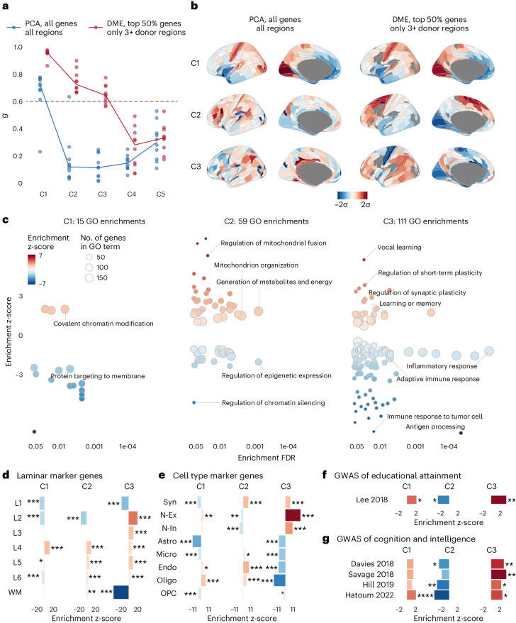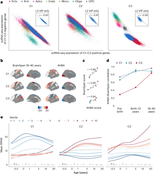 Human brain organization involves the coordinated expression of thousands of genes. For example, the first principal component (C1) of cortical transcription identifies a hierarchy from sensorimotor to association regions. In this study, optimized processing of the Allen Human Brain Atlas revealed two new components of cortical gene expression architecture, C2 and C3, which are distinctively enriched for neuronal, metabolic and immune processes, specific cell types and cytoarchitectonics, and genetic variants associated with intelligence. Using additional datasets (PsychENCODE, Allen Cell Atlas and BrainSpan), we found that C1-C3 represent generalizable transcriptional programs that are coordinated within cells and differentially phased during fetal and postnatal development. Autism spectrum disorder and schizophrenia were specifically associated with C1/C2 and C3, respectively, across neuroimaging, differential expression and genome-wide association studies. Evidence converged especially in support of C3 as a normative transcriptional program for adolescent brain development, which can lead to atypical supragranular cortical connectivity in people at high genetic risk for schizophrenia.