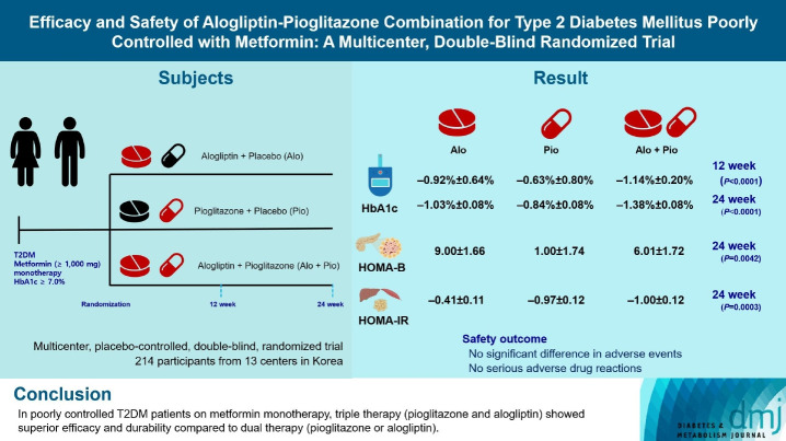 Methods: The Practical Evidence of Antidiabetic Combination Therapy in Korea (PEAK) was a multicenter, placebo-controlled, double-blind, randomized trial. A total of 214 participants were randomized to receive alogliptin+pioglitazone (Alo+Pio group, n=70), alogliptin (Alo group, n=75), or pioglitazone (Pio group, n=69). The primary outcome was the difference in glycosylated hemoglobin (HbA1c) levels between the three groups at baseline to 24 weeks. For durability, the achievement of HbA1c levels <7% and <6.5% was compared in each group. The number of adverse events was investigated for safety.