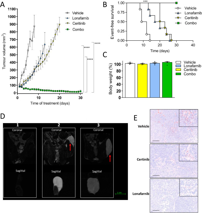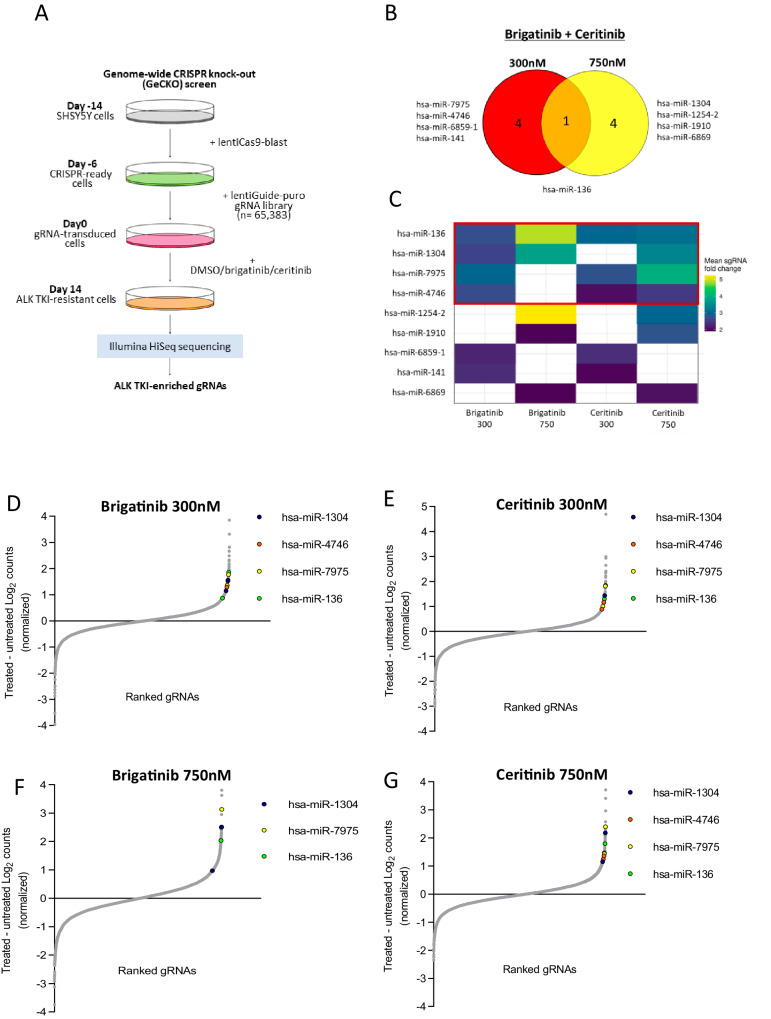 Targeting Anaplastic lymphoma kinase (ALK) is a promising therapeutic strategy for aberrant ALK-expressing malignancies including neuroblastoma, but resistance to ALK tyrosine kinase inhibitors (ALK TKI) is a distinct possibility necessitating drug combination therapeutic approaches. Using high-throughput, genome-wide CRISPR-Cas9 knockout screens, we identify miR-1304-5p loss as a desensitizer to ALK TKIs in aberrant ALK-expressing neuroblastoma; inhibition of miR-1304-5p decreases, while mimics of this miRNA increase the sensitivity of neuroblastoma cells to ALK TKIs. We show that miR-1304-5p targets NRAS, decreasing cell viability via induction of apoptosis. It follows that the farnesyltransferase inhibitor (FTI) lonafarnib in addition to ALK TKIs act synergistically in neuroblastoma, inducing apoptosis in vitro. In particular, on combined treatment of neuroblastoma patient derived xenografts with an FTI and an ALK TKI complete regression of tumour growth is observed although tumours rapidly regrow on cessation of therapy. Overall, our data suggests that combined use of ALK TKIs and FTIs, constitutes a therapeutic approach to treat high risk neuroblastoma although prolonged therapy is likely required to prevent relapse.