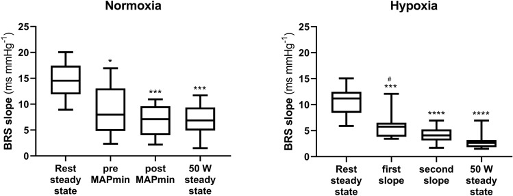 Results: Upon exercise onset in N, MAP fell to a minimum (MAPmin) then recovered. BRS decreased immediately from 14.7 ± 3.6 at rest to 7.0 ± 3.0 ms mmHg-1 at 50 W (p < 0.01). The first BRS sequence detected at 50 W was 8.9 ± 4.8 ms mmHg-1 (p < 0.05 vs. rest). In H, MAP showed several oscillations until reaching a new steady state. BRS decreased rapidly from 10.6 ± 2.8 at rest to 2.9 ± 1.5 ms mmHg-1 at 50 W (p < 0.01), as the first BRS sequence at 50 W was 5.8 ± 2.6 ms mmHg-1 (p < 0.01 vs. rest). CO-A1 was 2.96 ± 1.51 and 2.31 ± 0.94 l min-1 in N and H, respectively (p = 0.06). HR-A1 was 7.7 ± 4.6 and 7.1 ± 5.9 min-1 in N and H, respectively (p = 0.81).